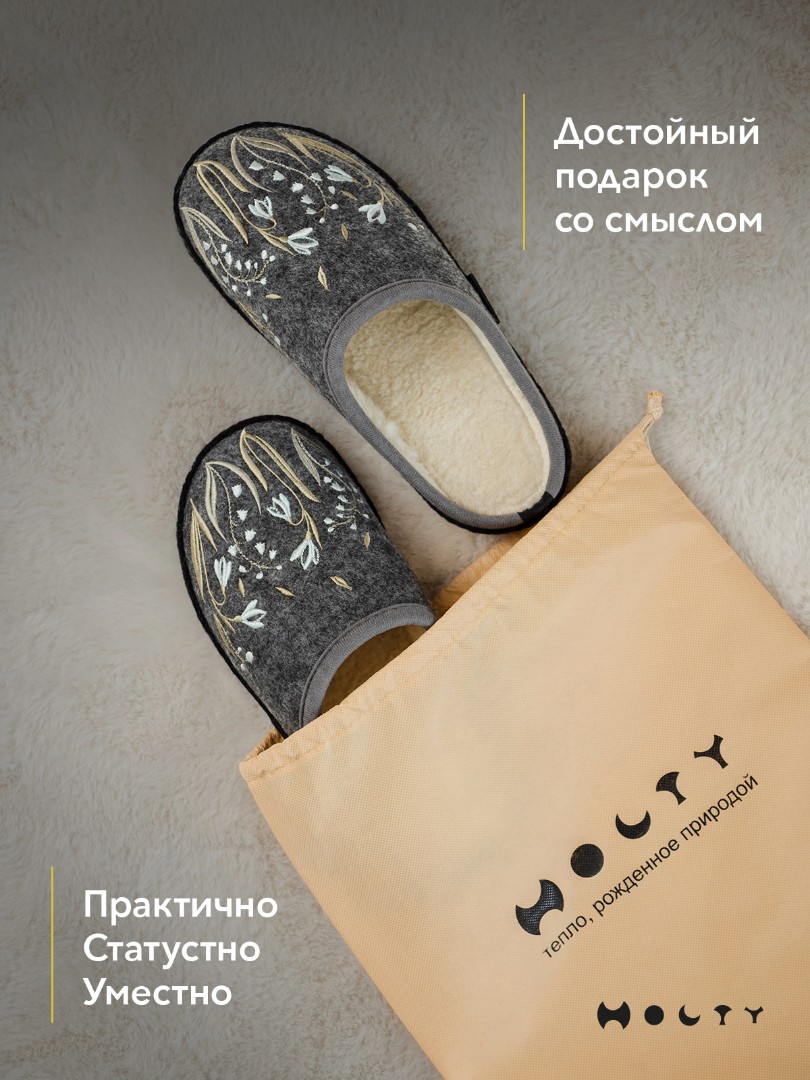 В них уютно и комфортно в любое время года: не жарко летом и тепло зимой. Тапочки для дома очень легкие - совершенно не ощущаются на ноге. А еще их просто надевать и снимать, для этого не нужно наклоняться. Тапки для дома из войлока не пачкаются, быстро впитывают влагу, Приятные и мягкие на ощупь. Про упаковку тоже не забыли. Тапочки придут к вам в бежевом фирменном мешочке. Прекрасно подойдут для подарка или в качестве презента себе.