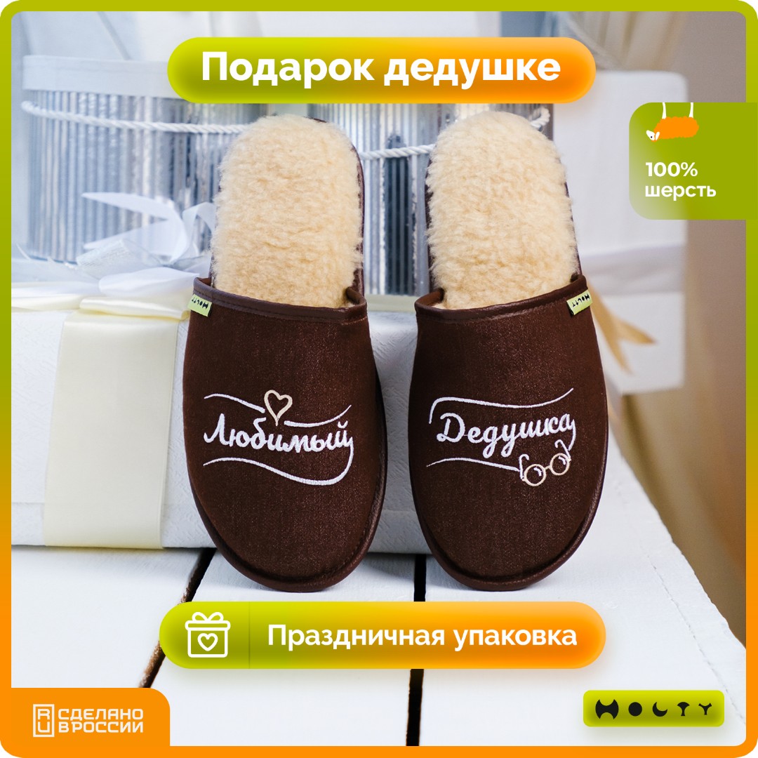 Купить подарочные меховые тапочки "Любимый дедушка" (коричневые) со стелькой памяти Вы можете в нашем интернет-магазине производителя изделий ТМ "Холти"! Доставка действует по Москве и всей России.