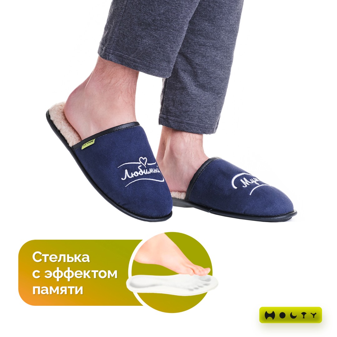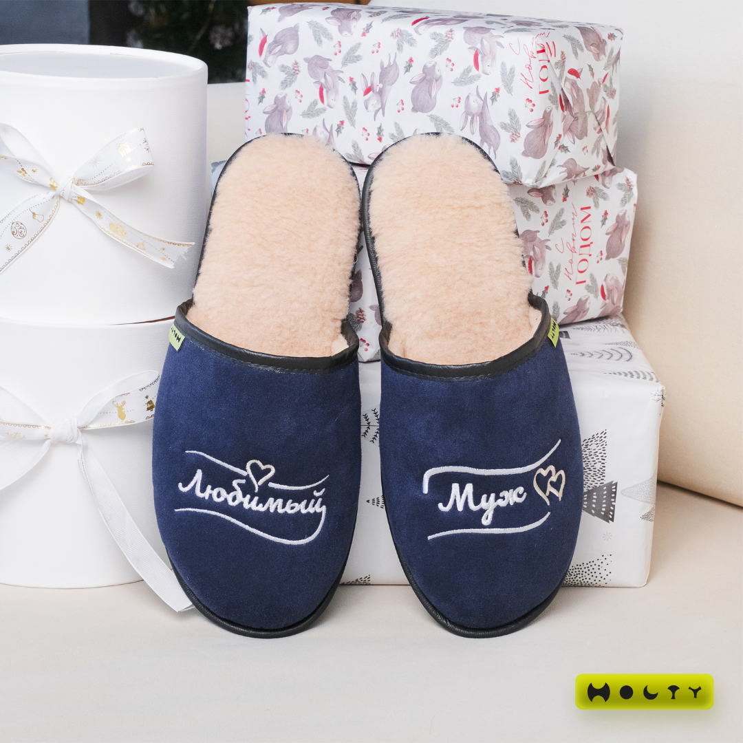 Купить подарочные меховые тапочки "Любимый муж" (синие) со стелькой памяти Вы можете в нашем интернет-магазине производителя изделий ТМ "Холти"! Доставка действует по Москве и всей России.