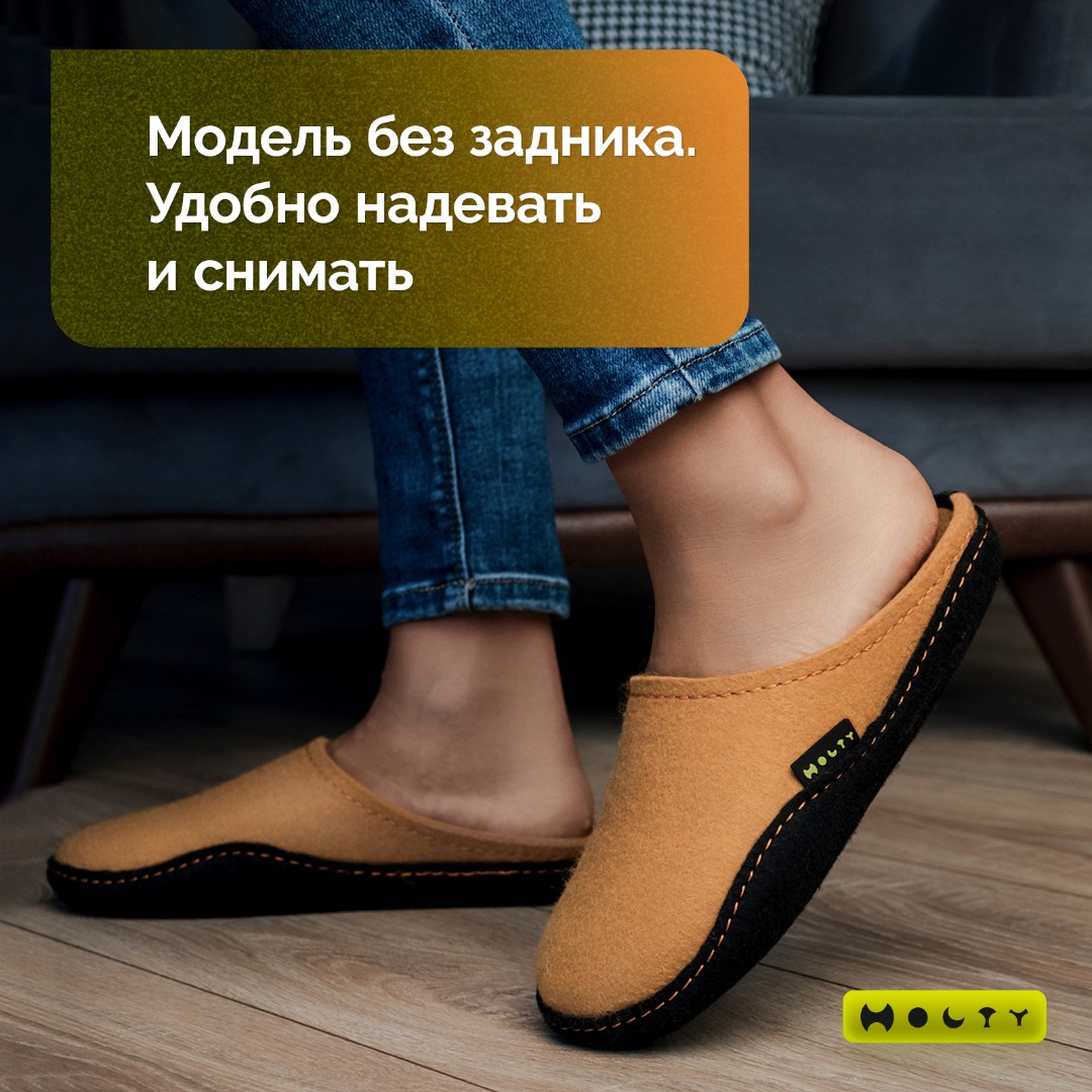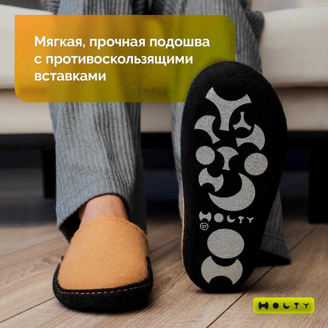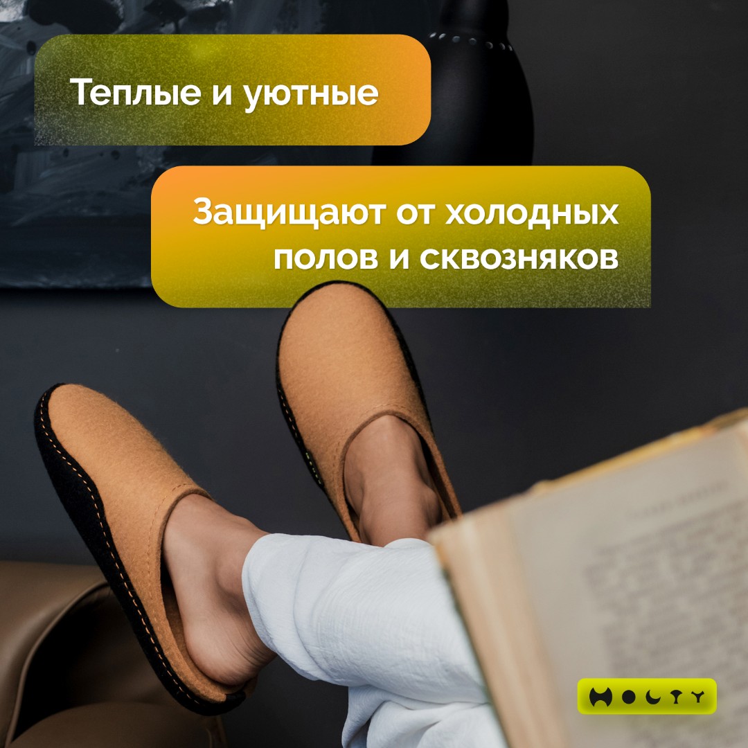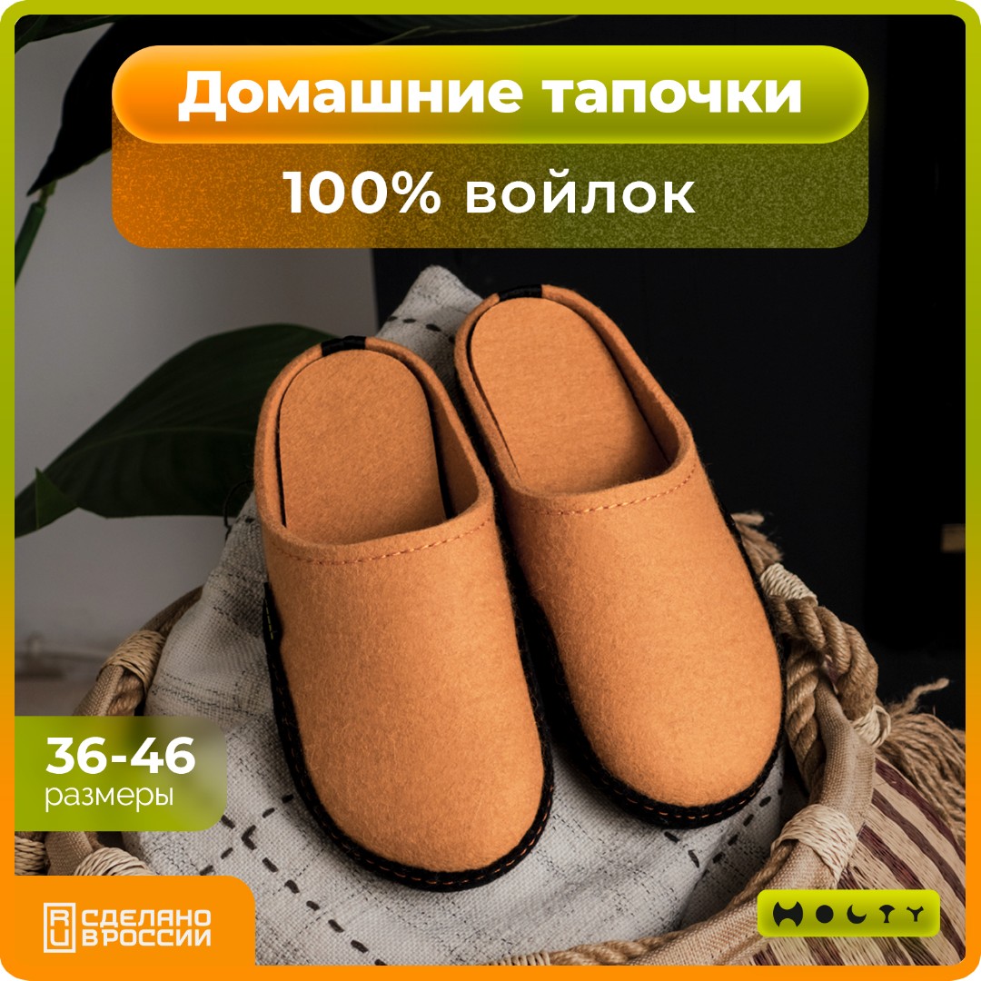 Состав войлока, который мы используем - 100 % овечья шерсть без синтетики. Войлочные тапочки практичные и мягкие, хорошо согревают в холода и впитывают лишнюю влагу, не позволяя ногам потеть. Такие тапочки долговечны: сохраняют презентабельный внешний вид и не теряют своих свойств. Благодаря открытой пятке их легко надевать, не наклоняясь. Стильные и удобные. Войлочные тапочки бежевого цвета подойдут как для загородного дома, так и для квартиры.
