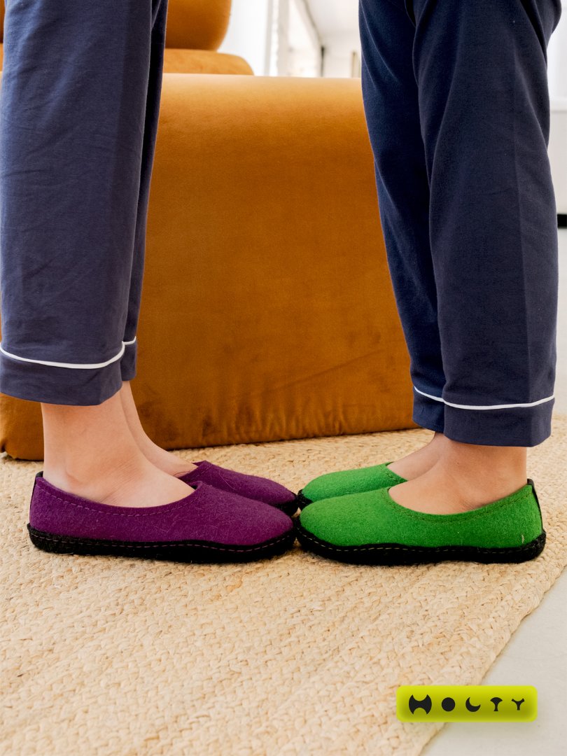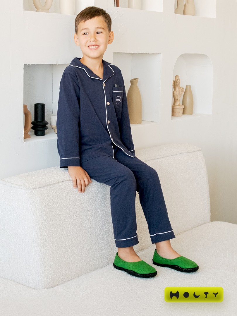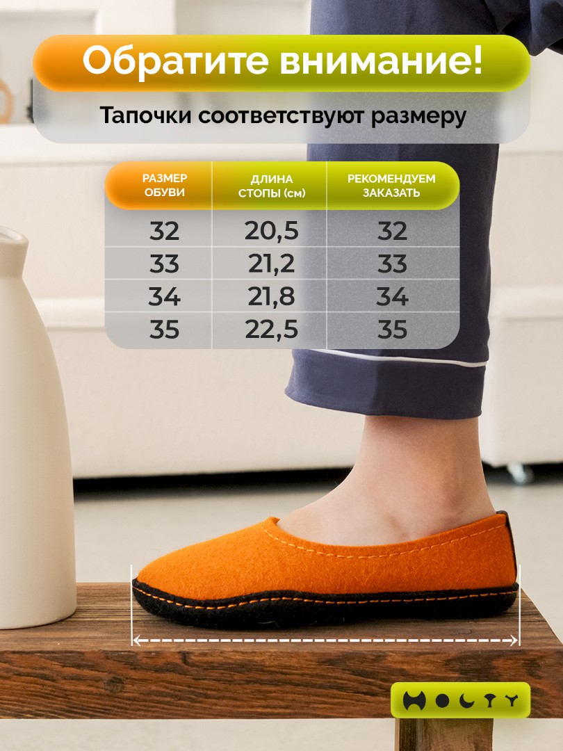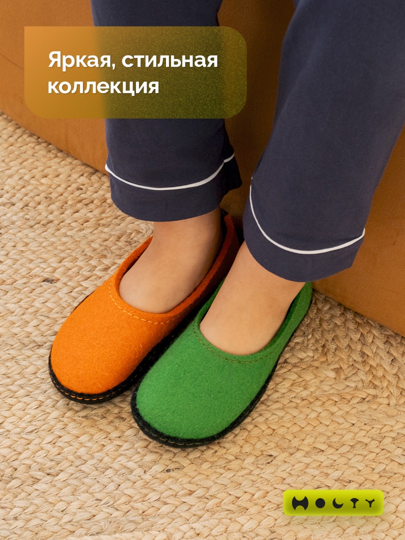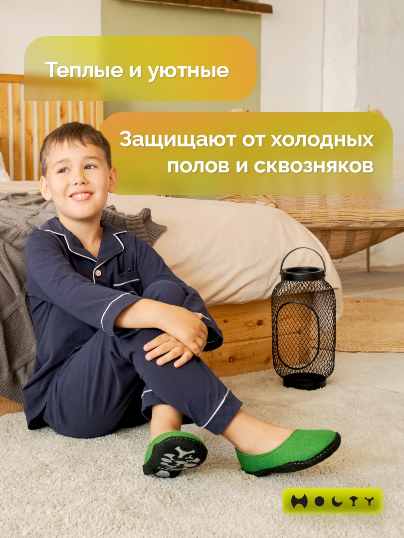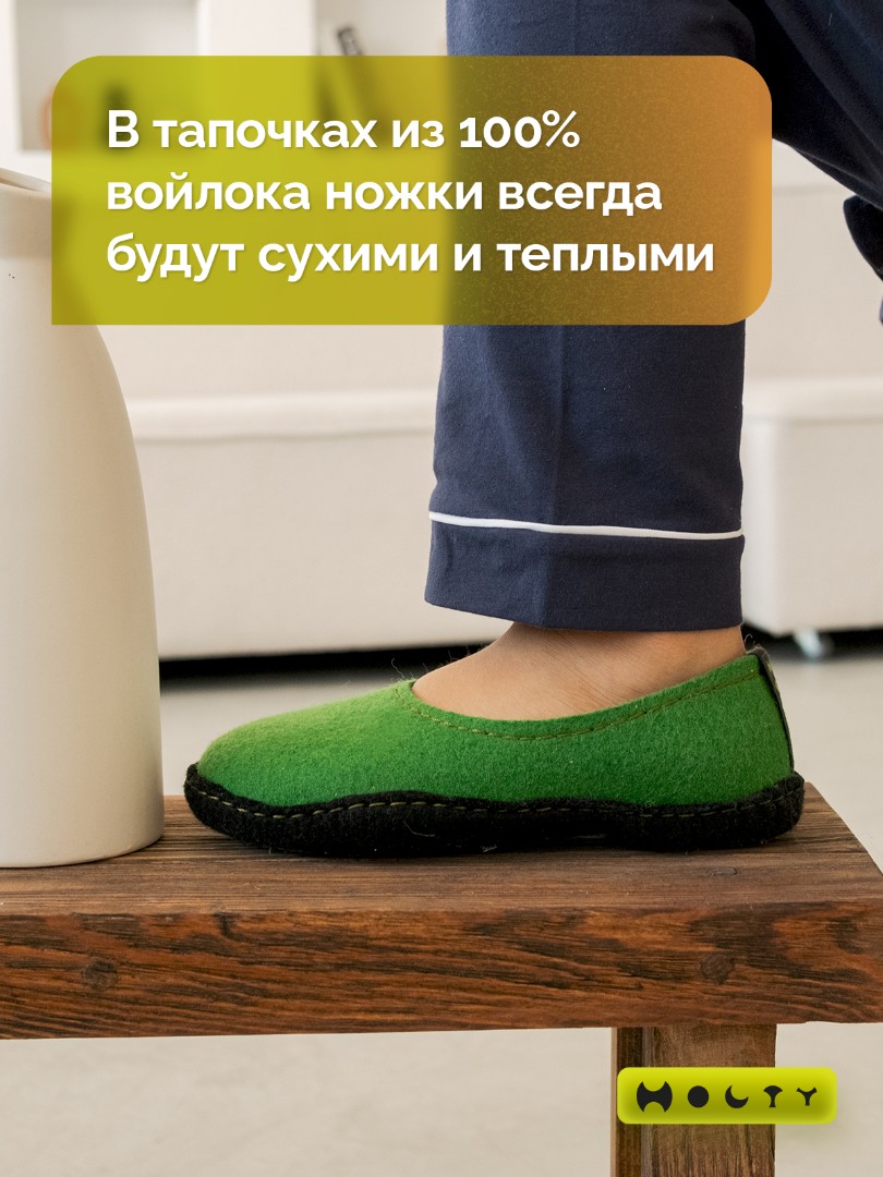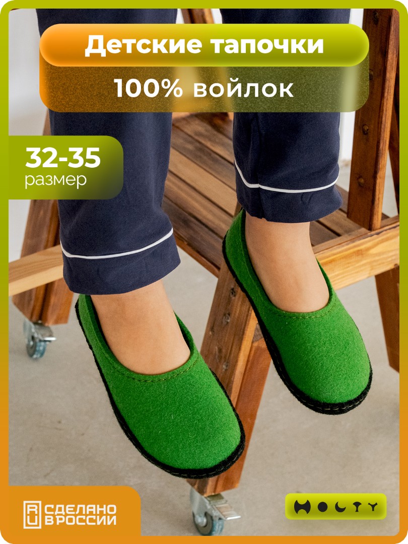 Состав войлока, который мы используем - 100 % овечья шерсть без синтетики. Войлочные тапочки для детей практичные и мягкие, хорошо согревают в холода и впитывают лишнюю влагу, не позволяя ногам потеть. Такие тапочки долговечны: сохраняют презентабельный внешний вид и не теряют своих свойств. Благодаря закрытой пятке не будут слетать во время активностей. Стильные и удобные. Детские войлочные тапочки зеленого цвета подойдут как для загородного дома, так и для квартиры.