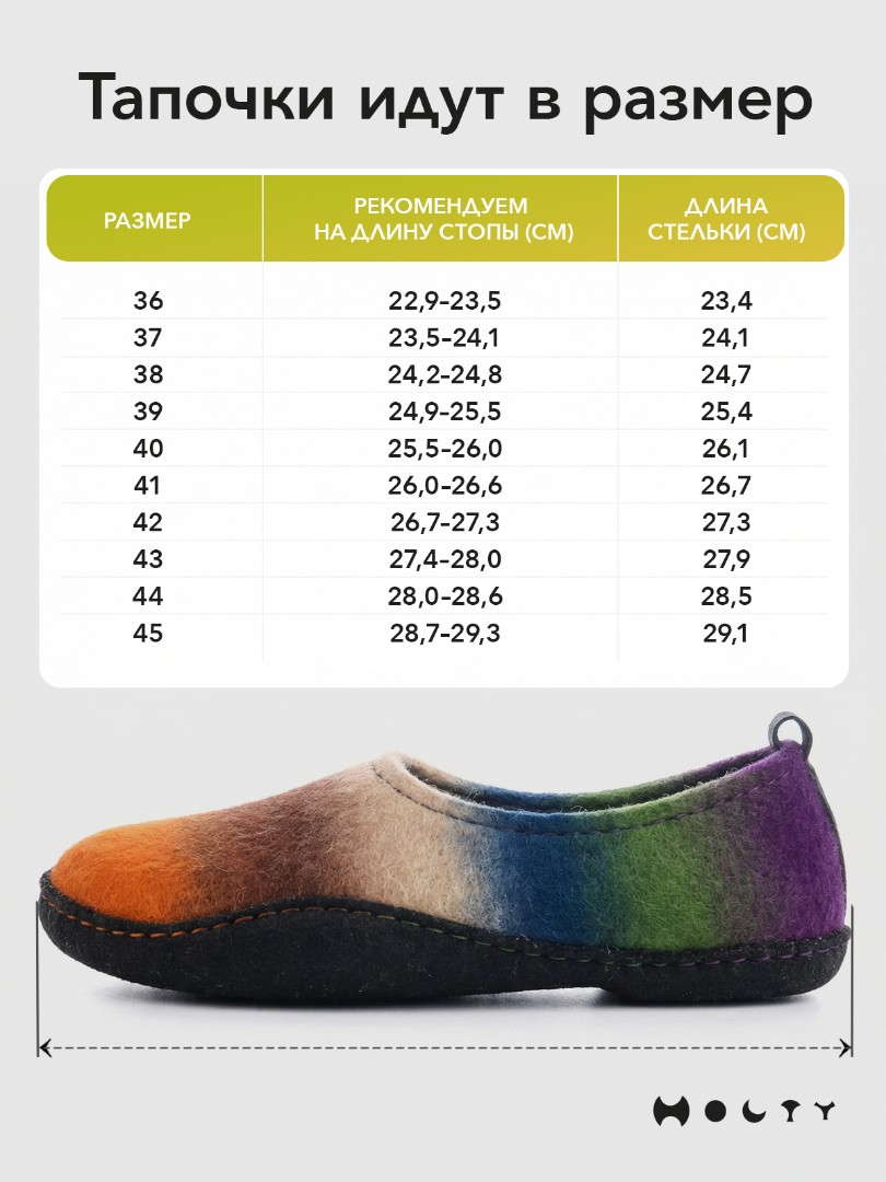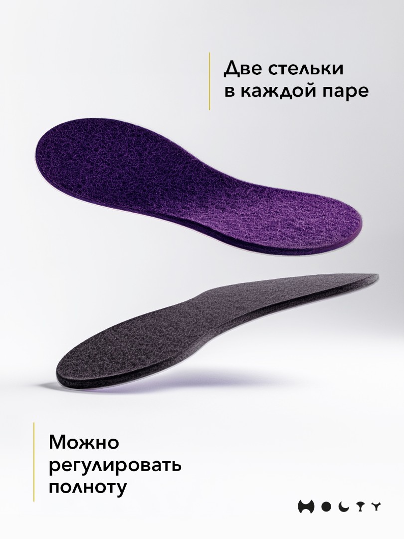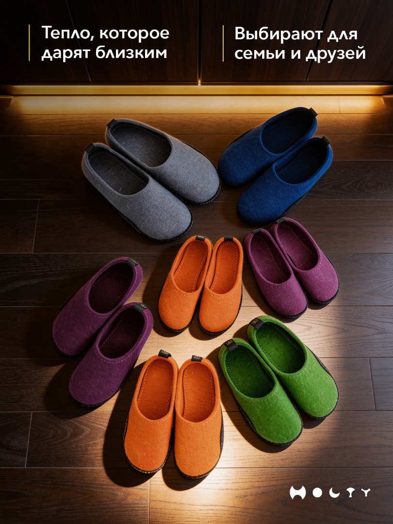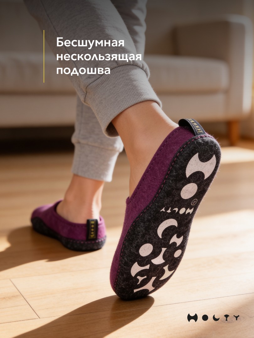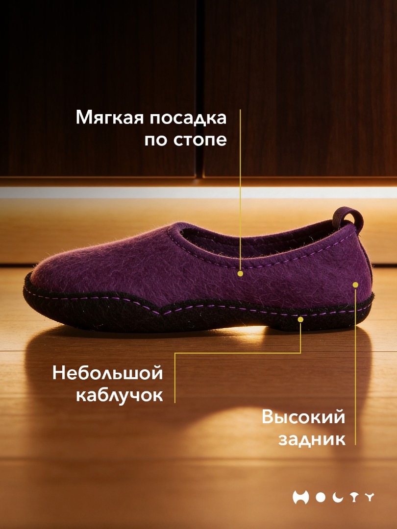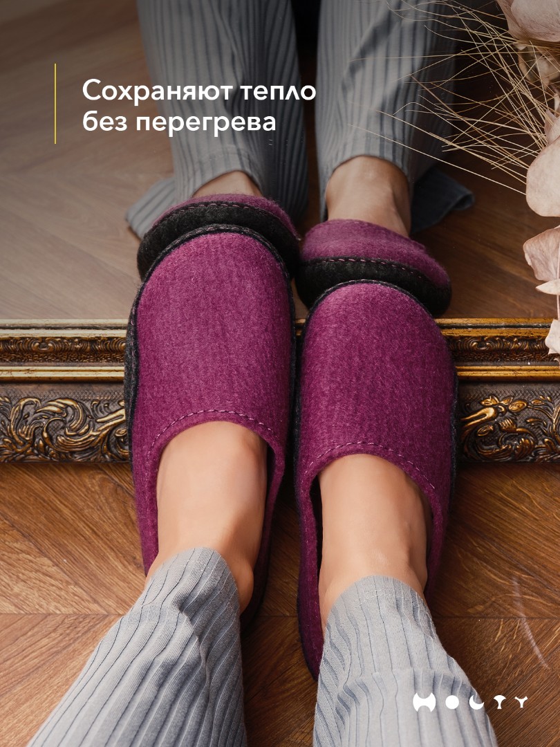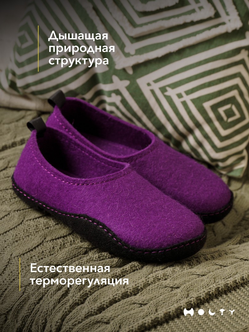 Состав войлока, который мы используем - 100 % овечья шерсть без синтетики. Войлочные тапочки практичные и мягкие, хорошо согревают в холода и впитывают лишнюю влагу, не позволяя ногам потеть. Такие тапочки долговечны: сохраняют презентабельный внешний вид и не теряют своих свойств. Благодаря закрытой пятке не будут слетать во время активных домашних дел. Стильные и удобные. Войлочные тапочки фиолетового цвета подойдут как для загородного дома, так и для квартиры.